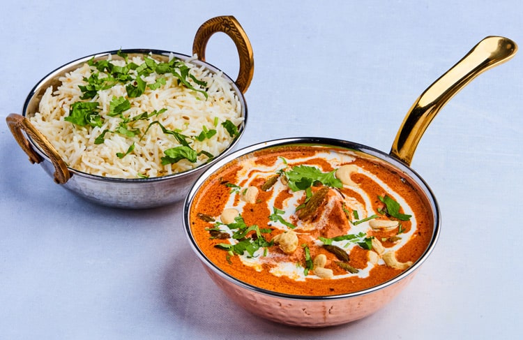 Grillet kylling stekes i tomatsaus som inneholder krydder, løk, rømme, hvitløk, ingefær, fløte og smør. Toppes med kasjunøtter, rosiner og fersk koriander