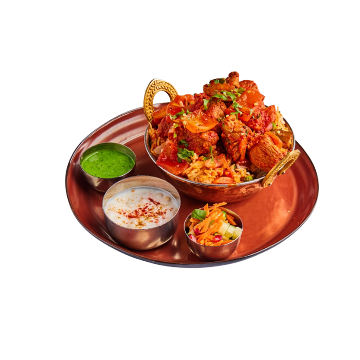 Ris woket med lam, lok og paprika. Tilberedt med biryani krydder og toppes med koriander, mandler og rosiner.