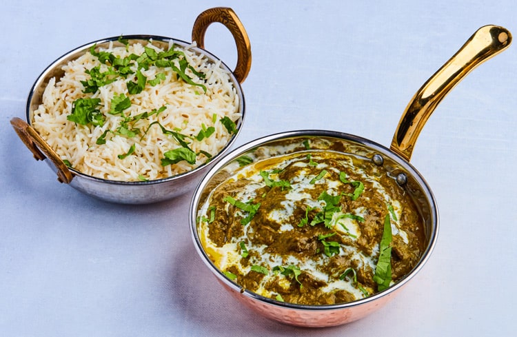 Lammekjøtt tilberedt i spinatsaus med fløte, rømme, ingefær, løk.