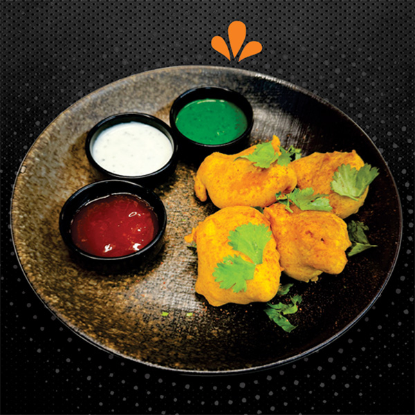 Tilberedt i kikertmel. Toppes med fersk koriander, hjemmelaget krydder og serveres med tre forskjellige chutney, en av de inneholder melk.