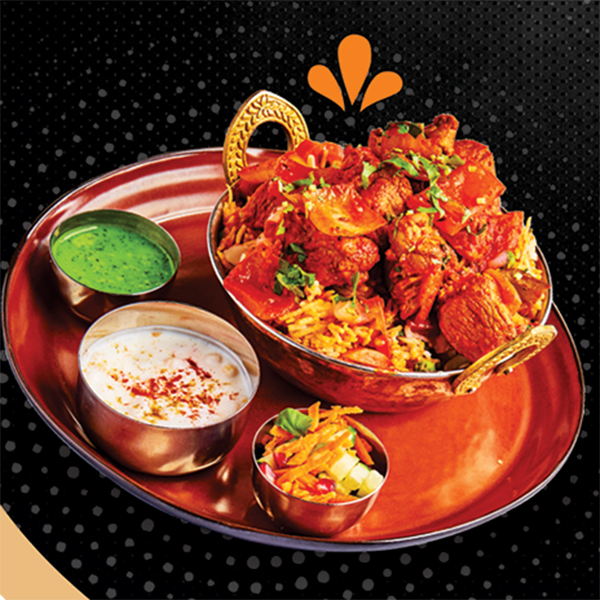 Ris woket med lam, løk og paprika. Tilberedt med biryani krydder og toppes med koriander, mandler og rosiner.