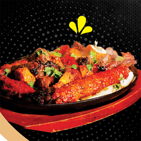 Tandoori kylling tikka, kylling kebab og kongereker. Toppes med krydret paprika, Iøk, sitron og fersk koriander.