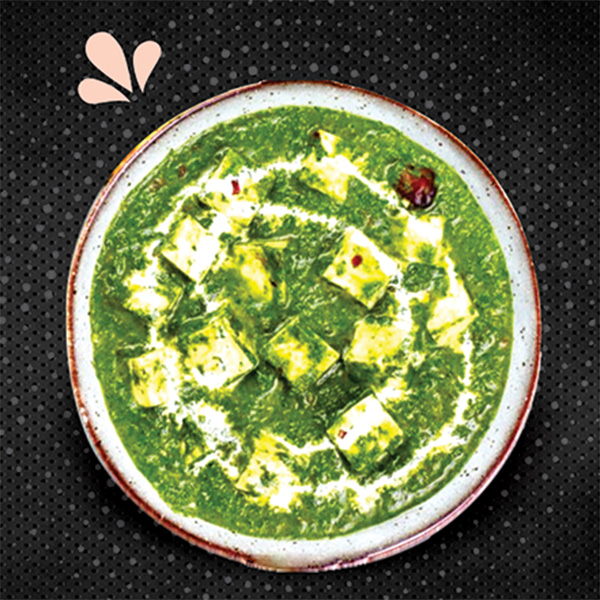Spinat kokt i fløte, rømme, smør, hvitløk, ingefær, løk, tomater og krydder, med hjmmelagede paneer/ osteterninger . Toppes med fersk koriander