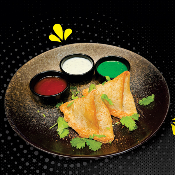 Krydret potetblanding innbakt i smørdeig. Toppes med fersk koriander, hjemmelaget krydder og serveres med tre forskjellige chutney, en av de inneholder melk.