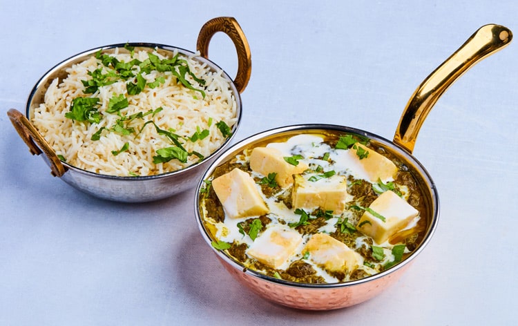 Spinat kokt i fløte, rømme, smør, hvitløk, ingefær, løk, tomater og krydder, med hjmmelagede paneer/ osteterninger . Toppes med fersk koriander
